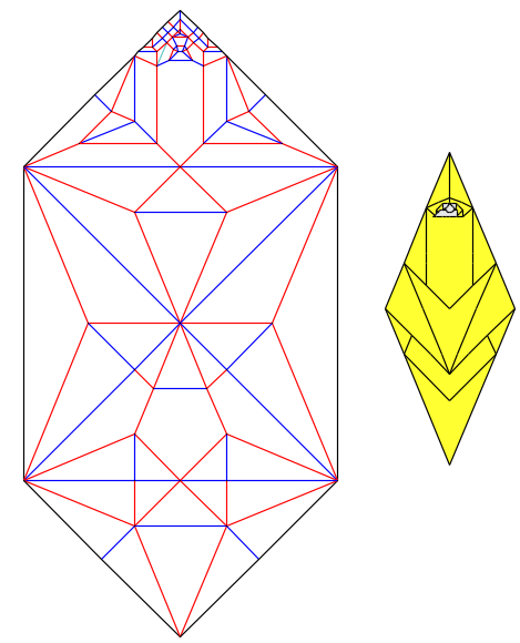 At some point when I had a dinner, I thought of a way to reduce the torso length. What if I started with blintzed bird base, but a small river is inserted to split the upper and lower body part? Something like this.