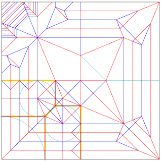 Now moving to the upper part of the head. There's no way I can make the spiky hair using an array of middle flaps in the main diagonal like my helicoprion's teeth. So I thought to lay them in the arc of the flap. This idea is similar with Kamiya's praying mantis arm spikes. The one touching paper edges would be used as color changed eyes. I can use seamless eye I used on peacock spider. Finally the upper beak that contains the casque can be made by reverse folds. The crease pattern is found purely by fiddling on the paper.